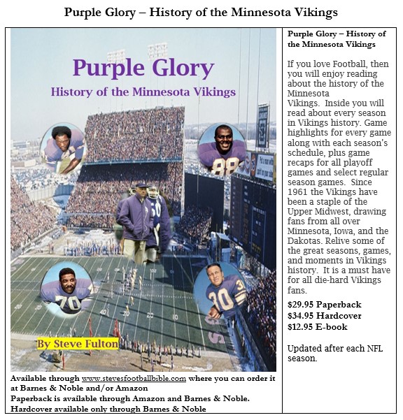 Available at Amazon.com: https://www.amazon.com/Purple-Glory-History-Minnesota-Vikings-Fulton/dp/139342208X/ref=sr_1_1?keywords=steve%27s+football+bible+purple+glory&qid=1638634038&s=books&sr=1-1